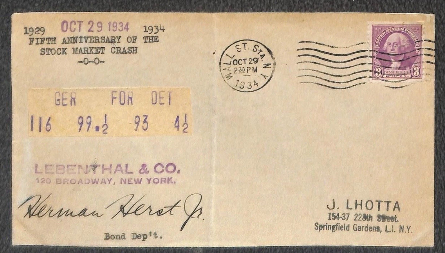 Herst was the sort of person who would jump on an opportunity. For example, I read a story of him mailing letters to fabricated addresses in Tokyo Japan as soon as he heard about the Pearl Harbor bombing, and again to Berlin Germany when war was declared on Germany, just so that he could get interestingly franked envelopes when they were subsequently returned to him as undeliverable. So, he is definitely someone who would jump on the five-year anniversary of the "crash of 1929" to market these items. Note also that someone (Herst?) has written in pencil on the Hicks envelope (BO ND) tape that it is from October 29, 1934. So, he may have printed them in the morning, using historical prices, and mailed them in the afternoon.
